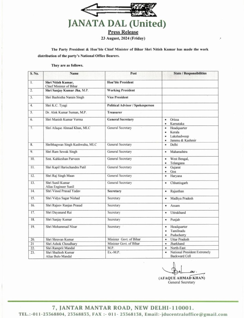 CM नीतीश ने अपने करीबी मनीष कुमार वर्मा को उड़िशा और कर्नाटक का प्रभारी बनाया है जबकि श्रीभगवान सिंह कुशवाहा को दिल्ली का प्रभारी, श्रवण कुमार को उत्तर प्रदेश का प्रभारी बनाया है। इसके साथ ही साथ राष्ट्रीय अध्यक्ष नीतीश कुमार ने पार्टी के अन्य नेताओं को राज्यों की जिम्मेवारी सौंपी है।